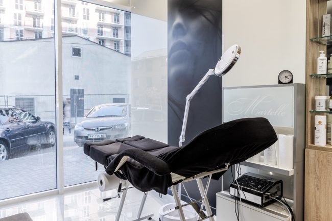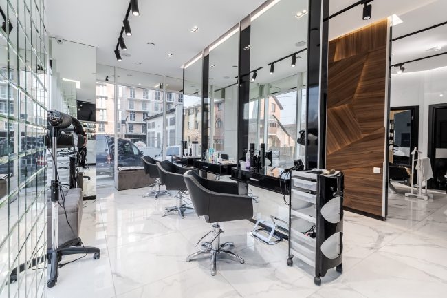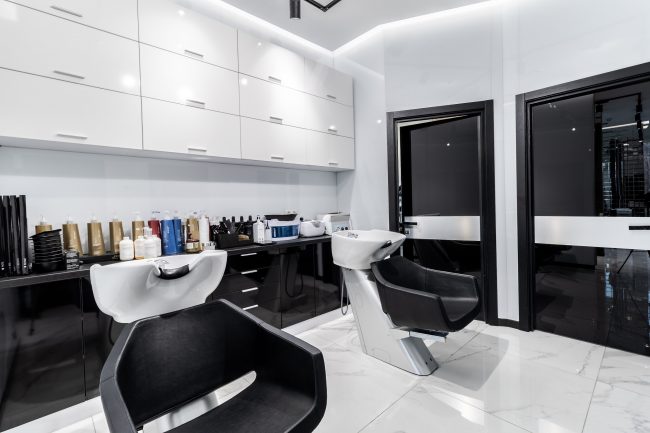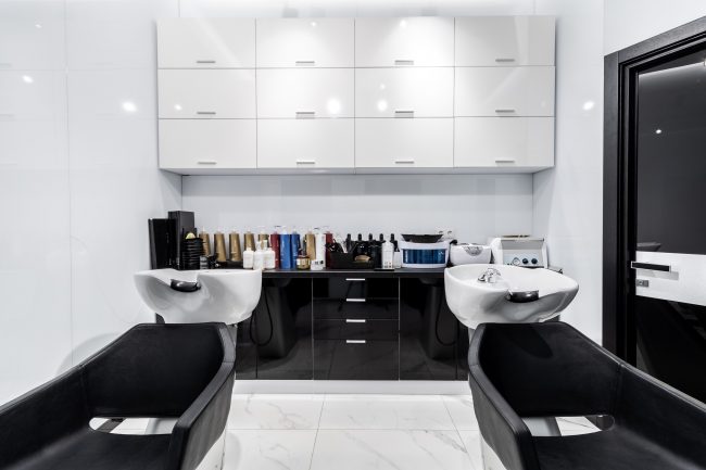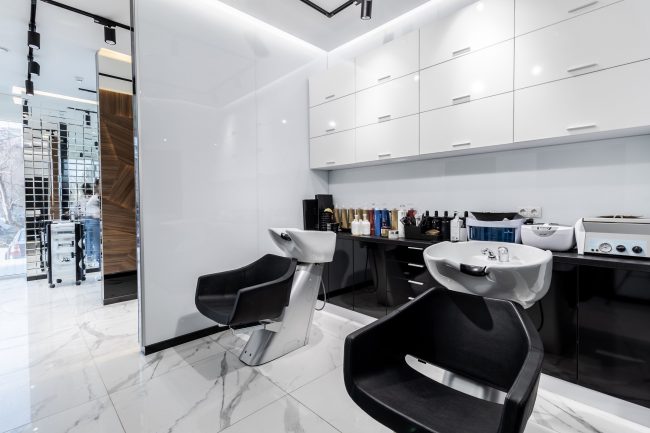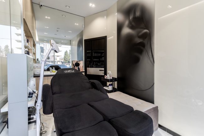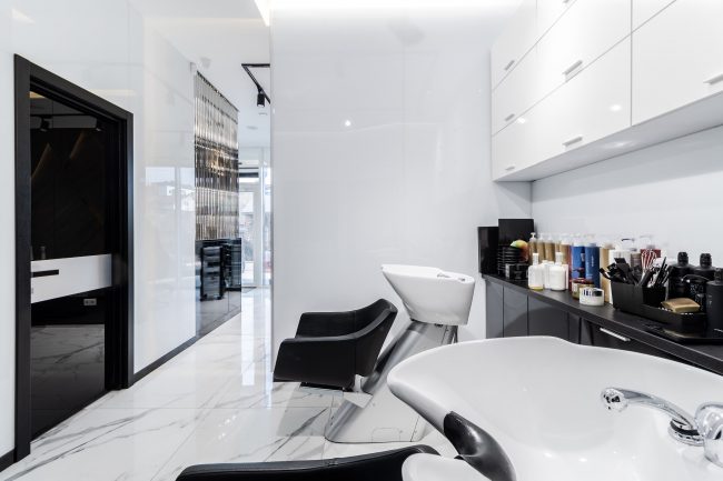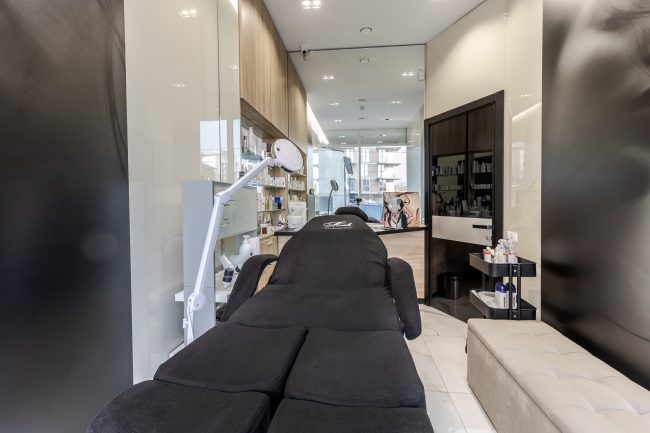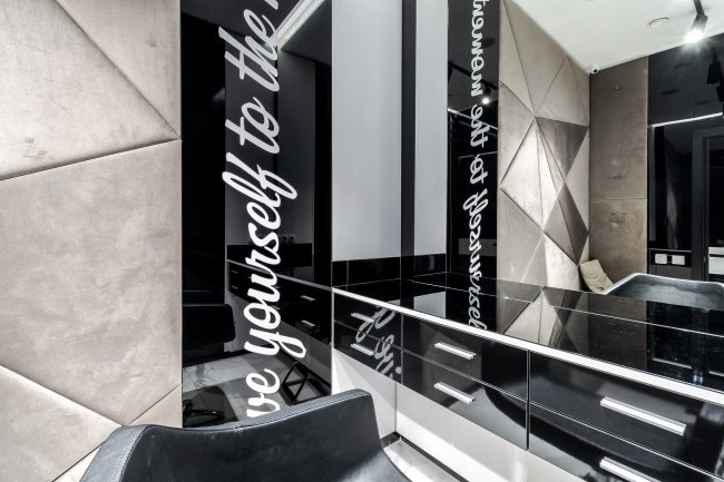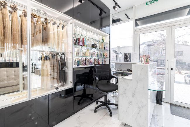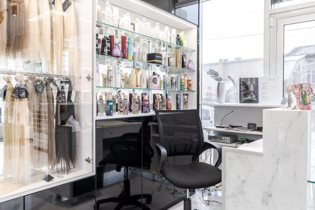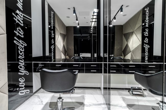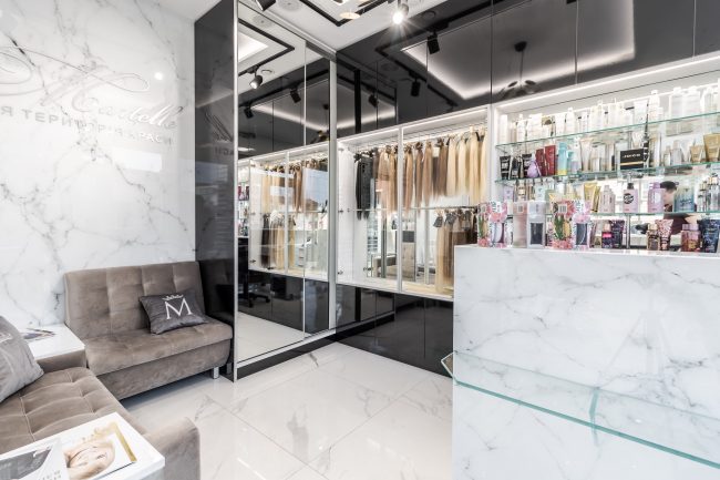 Visitors can immediately see glass cabinets displaying branded products. The salon’s logo with a telling slogan on the wall also attracts attention.