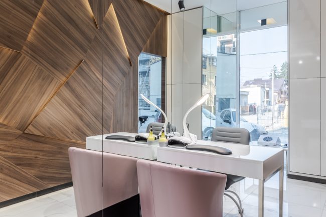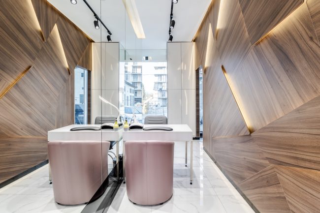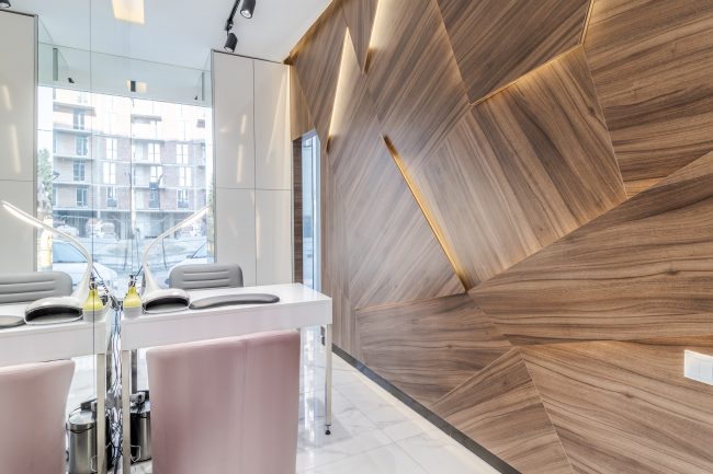The halls are separated by narrow partitions. The hairdresser’s area stands out thanks to three tall mirrors. The walls of the clients’ room for nail services are decorated with panels of various geometric shapes, layered like shingles, with lights hidden underneath.