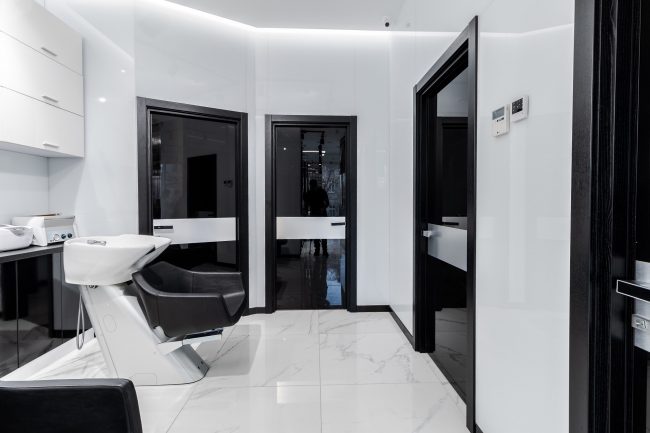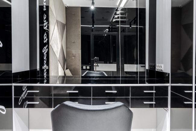 There is a separate room for those wishing to change their hair color, equipped with modern sinks. It maintains a strictly minimalist design in black and white. All doors share an identical design. The balance of black and white is achieved in the furniture set, consisting of black cabinets and white hanging shelves.