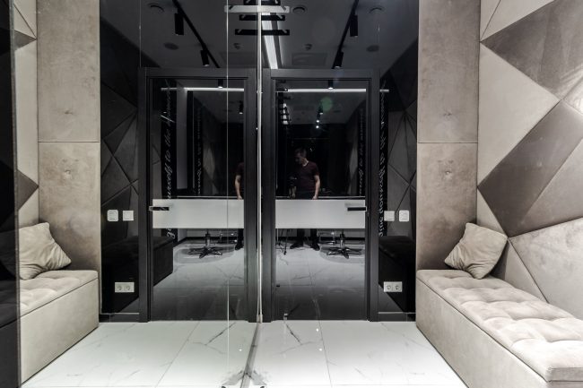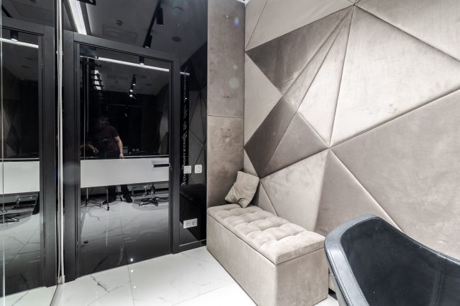 The beauty salon interior design is thought out down to the smallest details. Given the specifics of the client’s niche, the concept of restrained luxury was chosen. The interior immediately draws attention with marble tiles on the floor and on the wall opposite the entrance, a tall wardrobe for clients’ clothes with mirrored doors, black glossy panels adorning the wall behind the reception, and a glass mosaic reaching the ceiling between the tall windows to the left of the entrance door.