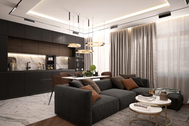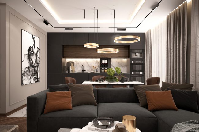The kitchen impresses with its combination of graphite and wooden fronts, and the built-in appliances ensure convenience. A three-ring chandelier above the dining table creates a striking focal point in the evening.