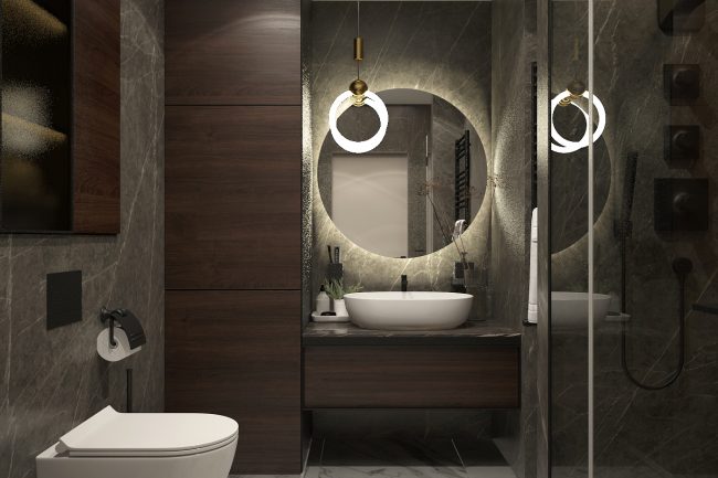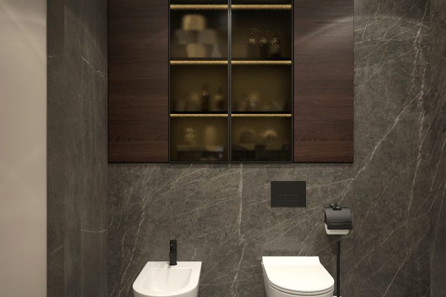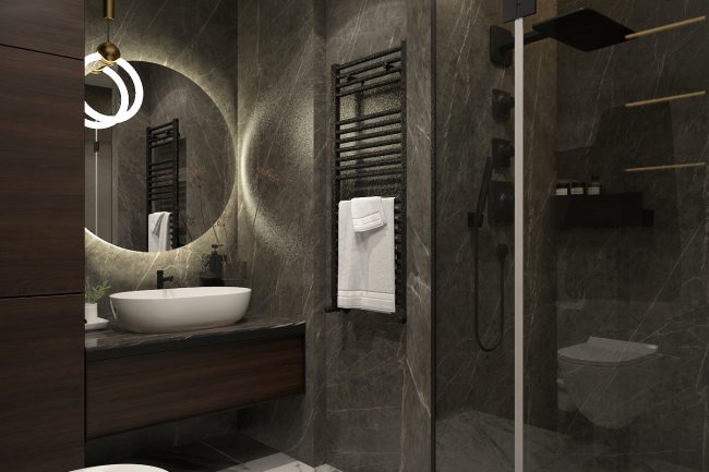 The large bathroom not only looks stylish but also offers all the necessary conveniences. Black fixtures give a modern and sophisticated touch. This apartment embodies luxury and comfort in every detail.