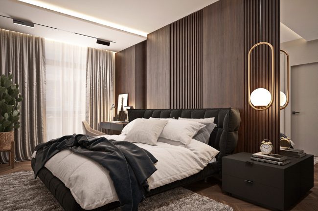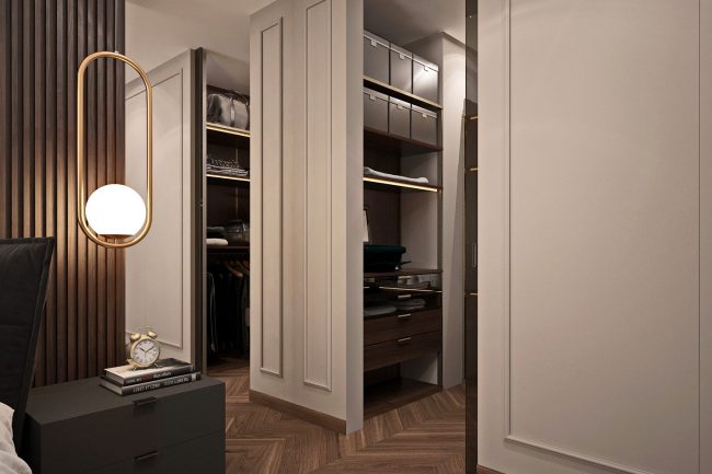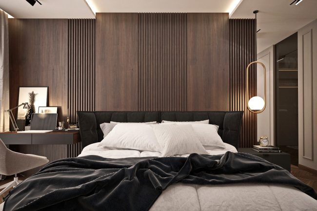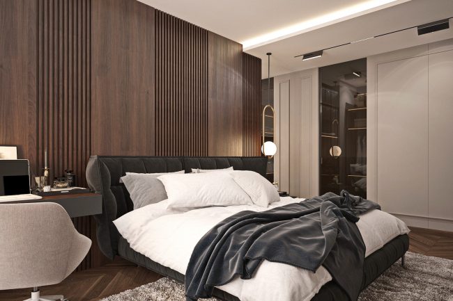 The bedroom, located behind hidden doors, is distinguished by its elegance and coziness. An Italian bed and wooden wall finishes add luxury to the space. The wardrobe and workspace in the bedroom enhance its functionality.