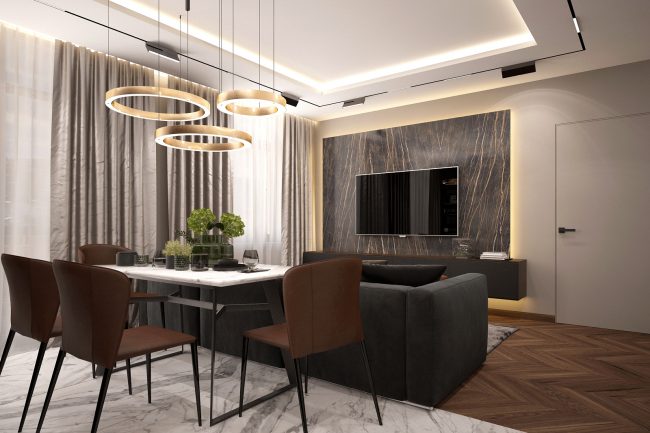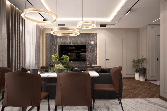 In the living room, you will be impressed by the huge TV mounted on large-format tiles in brown shades. The oak engineered wood flooring, laid in a herringbone pattern, adds natural warmth. A dining table and corner sofa create a cozy atmosphere for family meals and evening relaxation.