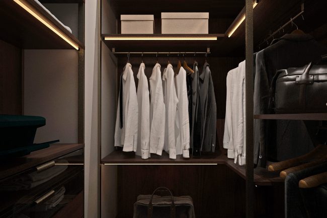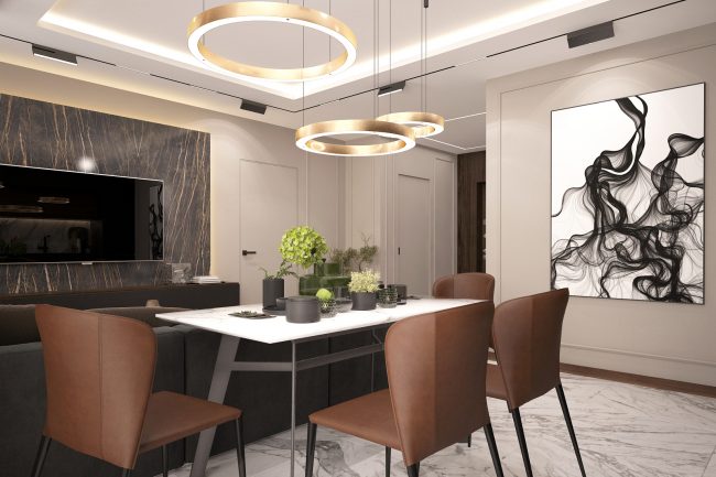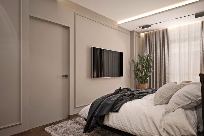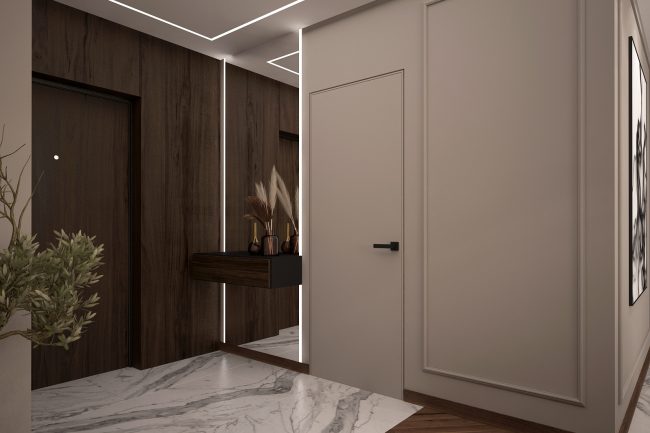 Interior design of a luxurious one-room apartment begins as you pass through a spacious hallway. You will feel the atmosphere of comfort and luxury. A large mirror makes the hallway appear even more spacious, while the distinct entrance to the wardrobe through sliding doors and the bathroom adds functionality.