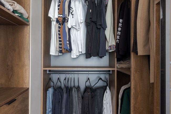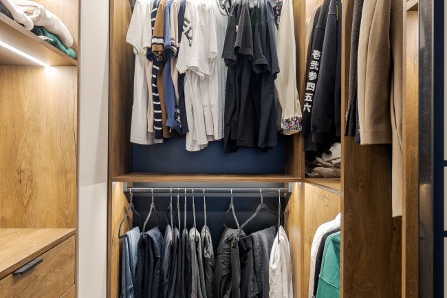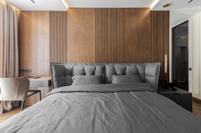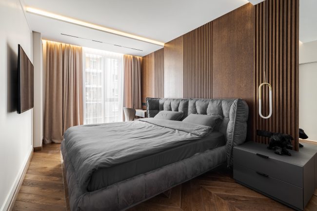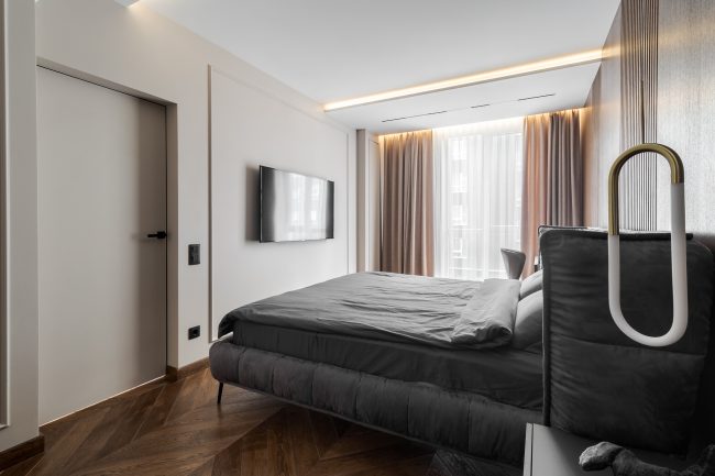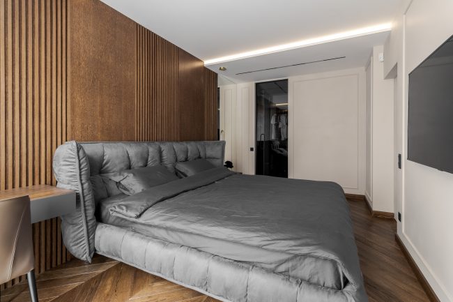 Z minimalistycznie urządzanej sypialni z szerokim łóżkiem, ściennym panelem TV i stolikiem na laptopa, po prawej stronie znajduje się wejście do garderoby, wyposażonej w półki i szafę na ubrania.