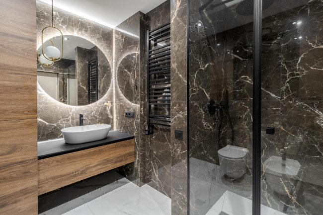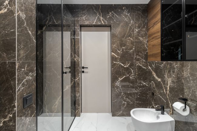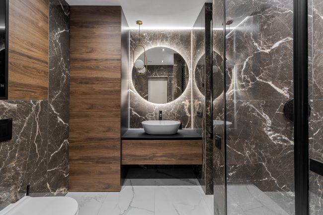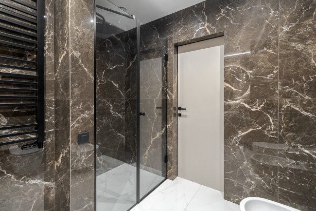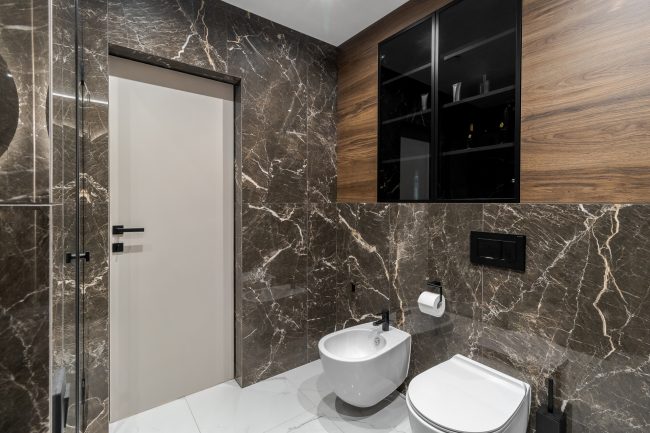 Ściany łazienki wyłożone są luksusowym czarnym marmurem z białymi żyłkami. Umywalka o nowoczesnej, owalnej formie zamontowana jest w meblach o frontach w drewnianym wykończeniu, odpornych na wilgoć. Nad nią wbudowane jest duże, okrągłe lustro. Wśród wyposażenia sanitarnego znajduje się duża, dwudrzwiowa kabina prysznicowa, toaleta i bidet.