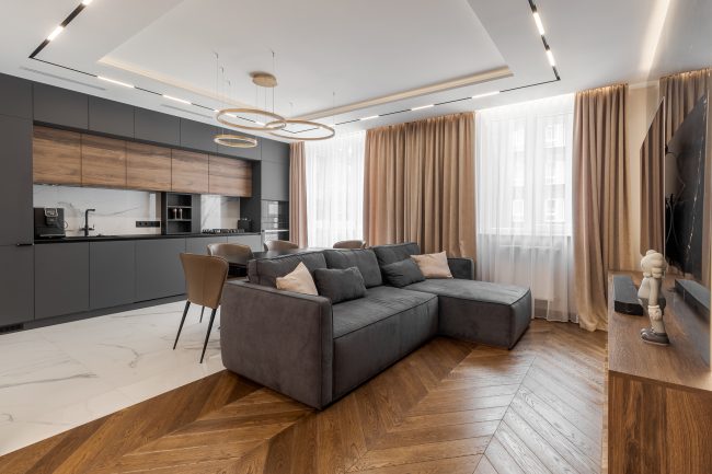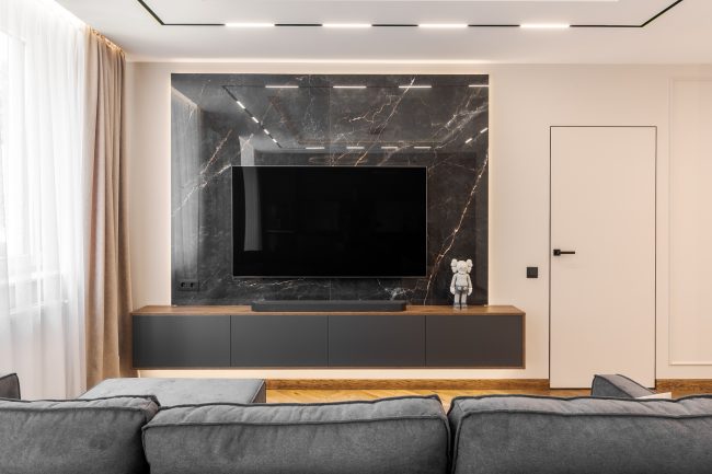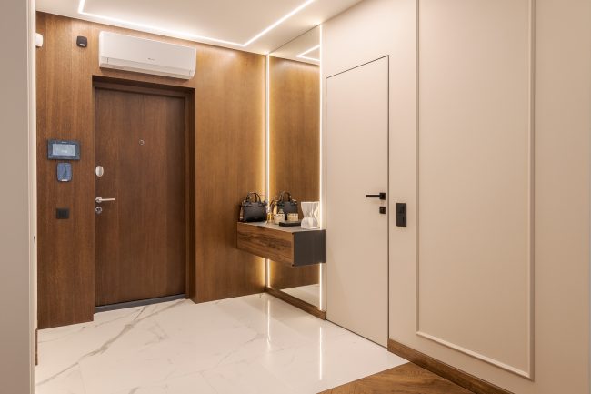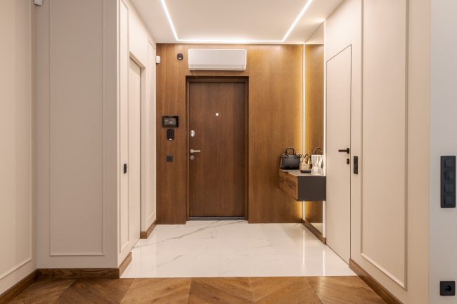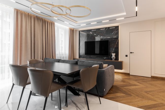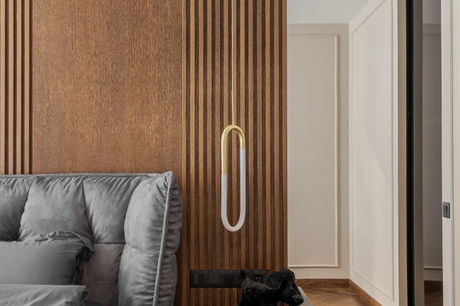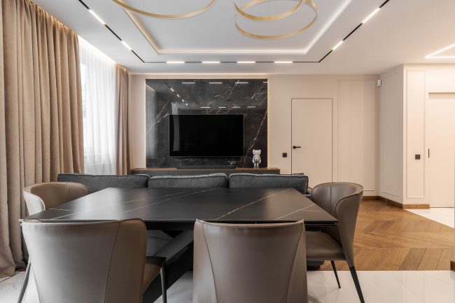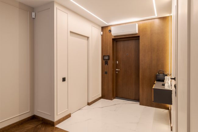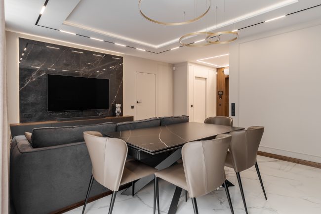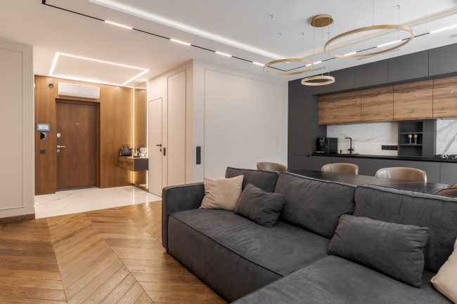 Oświetlenie mieszkania zaprojektowane zostało zgodnie z najnowszymi trendami — w postaci linii świetlnych na suficie i w otworach drzwiowych, z regulacją jasności i barwy.