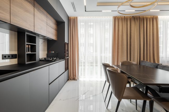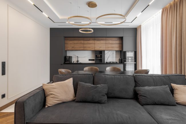 W projekcie mieszkania matowa faktura ciemnoszarych frontów kuchennych powtarza się w wizualnej miękkości zamszowej tapicerki kanapy i podkreślona jest kontrastem z fakturą naturalnego drewna drzwiczek szafek wiszących.