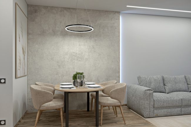 Design wnętrza trzypokojowego mieszkania w nowoczesnym stylu z elementami loftu zachwyca swoją funkcjonalnością i stylowością. Dzięki skomplikowanemu planowaniu mieszkanie ma dwa pokoje dziecięce, jedną sypialnię oraz przestronną kuchnię z salonem i jadalnią.