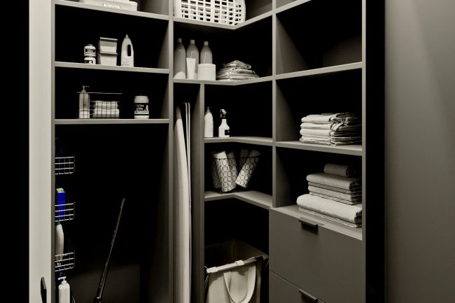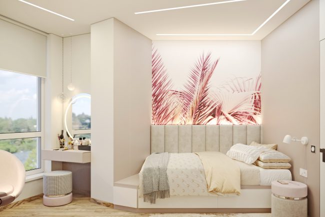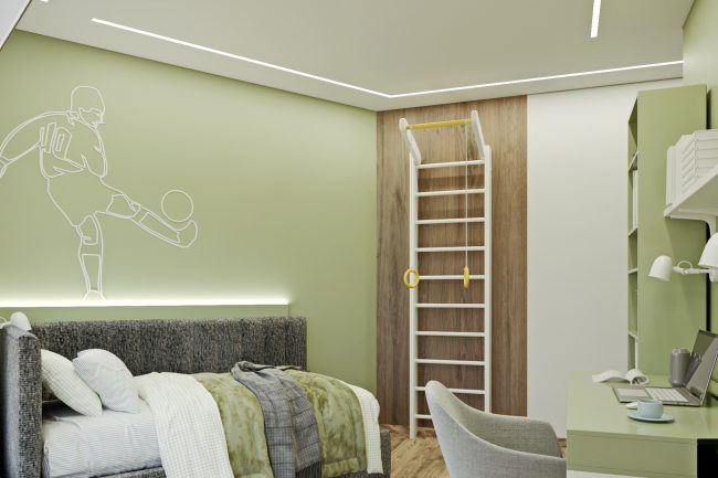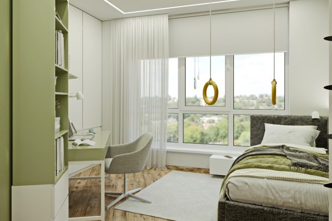 W mieszkaniu znajdują się dwa pokoje dziecięce, mimo ostrych kątów w pokojach dziecięcych projektanci z powodzeniem wykorzystali przestrzeń, ustawiając meble tak, aby każdy kąt stał się funkcjonalny i przytulny.
