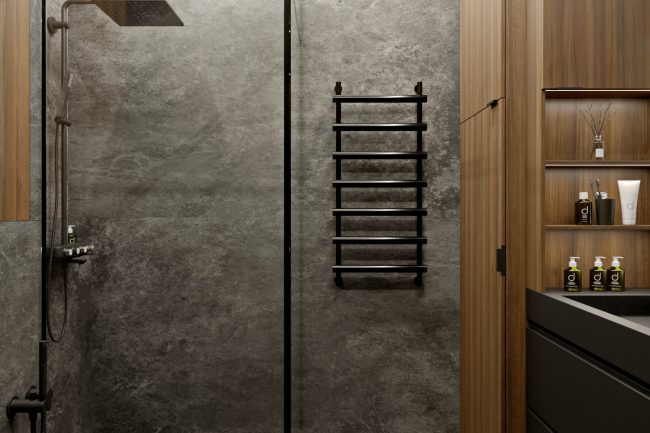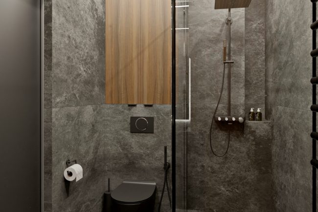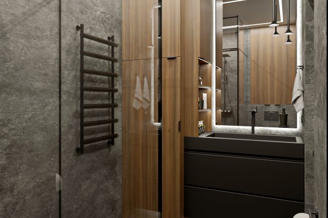 Łazienka wykonana jest w ciemnych szarych odcieniach z wykorzystaniem płytek imitujących łupek. Czarna armatura i stylowe baterie dodają elegancji i nowoczesności temu pomieszczeniu. Ogólnie rzecz biorąc, projekt wnętrza tego mieszkania łączy komfort, styl i praktyczność, tworząc wspaniałe miejsce do życia.