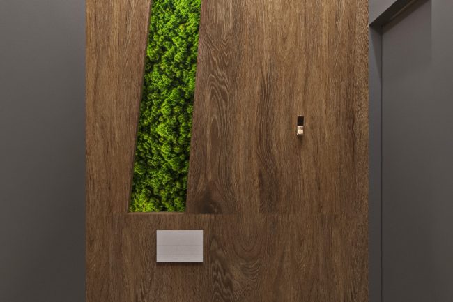 Sufit sklepu stał się nie tylko obiektem designu, ale i strefą zieleni. Zielone struktury tworzą atmosferę komfortu i naturalności.