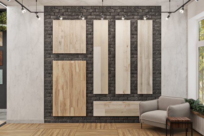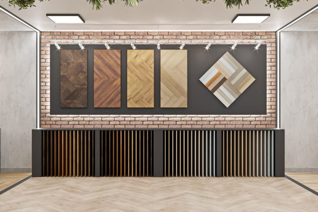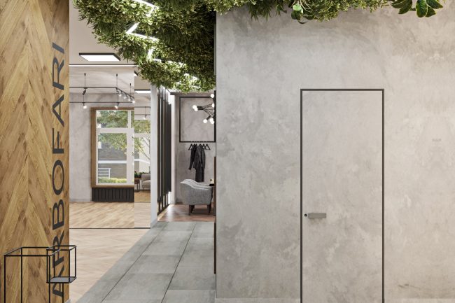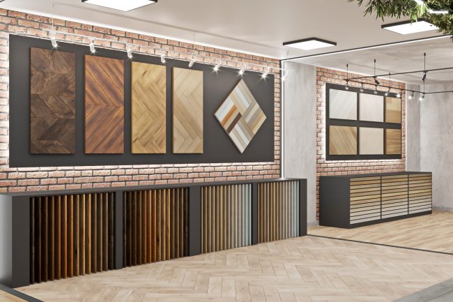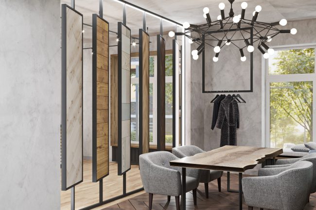 Sklep wyróżnia się jakościowym wykorzystaniem stylu Loft. Duże strefy z betonu na ścianach i suficie dodają industrialnego uroku. Wydobyte na wystawowy stand, różne materiały podłogowe, takie jak inżynieryjna deska parkietowa, winyl, deska dębowa i deska tarasowa, tworzą wrażenie własnego projektu artystycznego.