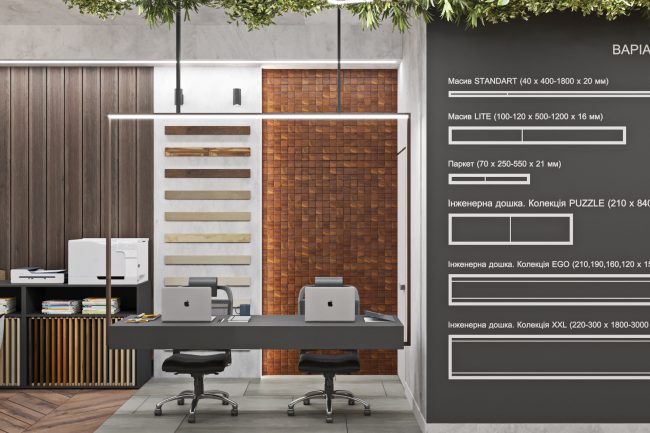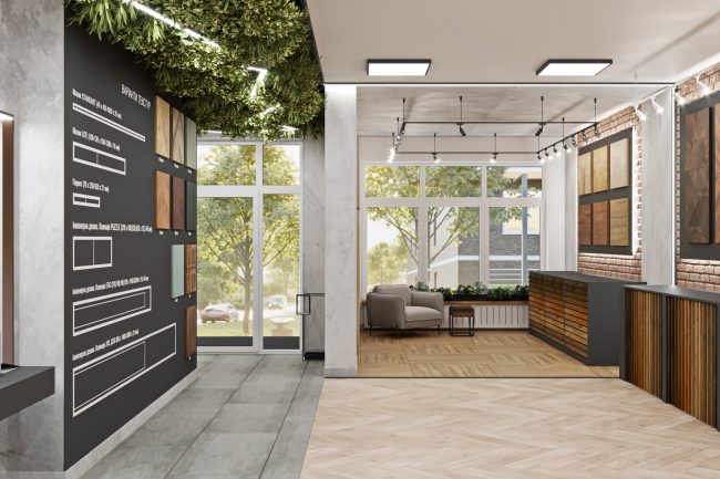 Wprowadzenie koncepcji stylu Loft w komercyjnym wnętrzu nowego sklepu z materiałami podłogowymi w Kijowie stało się wizytówką naszej firmy projektowej.
