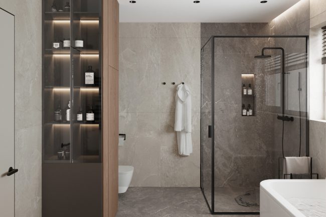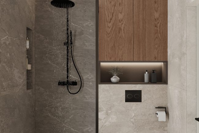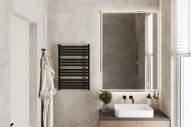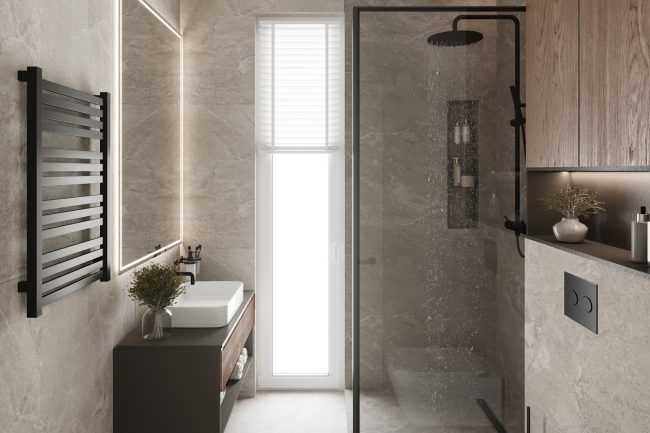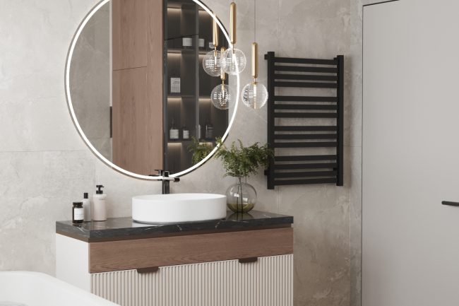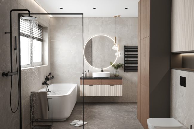 Łazienka została wykonana w odcieniach szarości, z użyciem płytek imitujących łupek i czarnej armatury. Wanna wolnostojąca i duże okno dodają przestrzeni jasności i przytulności. Strefa umywalki z czarnym blatem pod marmur i okrągłym lustrem z podświetleniem konturowym tworzy elegancki i nowoczesny wygląd.