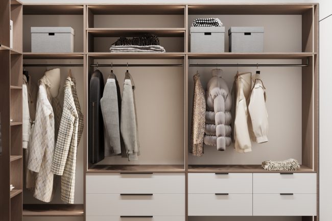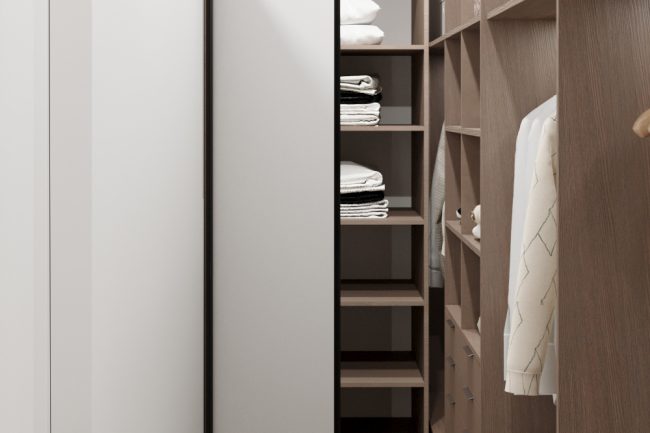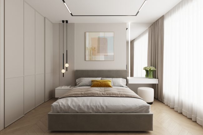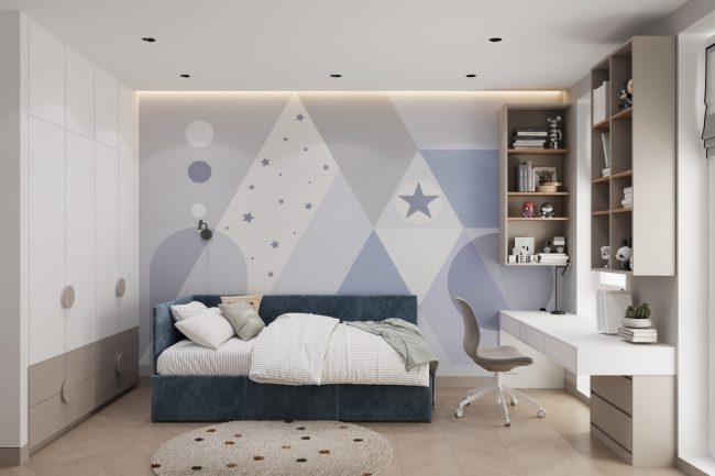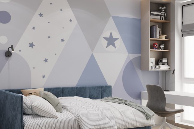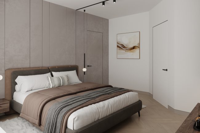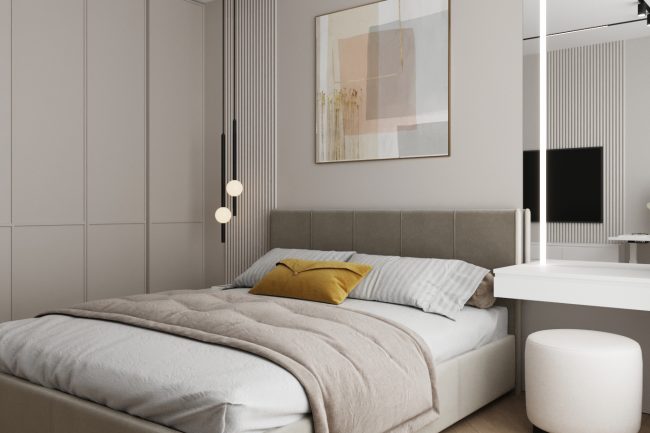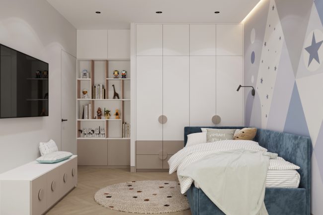 W sypialni właścicieli znajduje się duże szare miękkie łóżko, toaletka oraz lustro do sufitu, co dodaje przestrzeni i funkcjonalności. Pokój dziecięcy ozdobiony jest fototapetą z teksturą gwiazdek, ma komodę z telewizorem oraz dużą szafę na odzież i półki na zabawki, tworząc przestrzeń do kreatywności i zabawy.