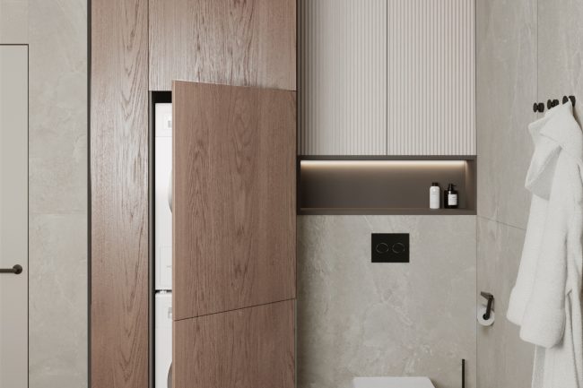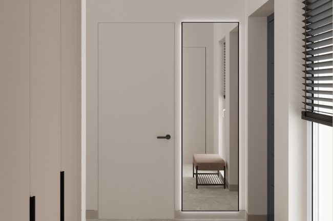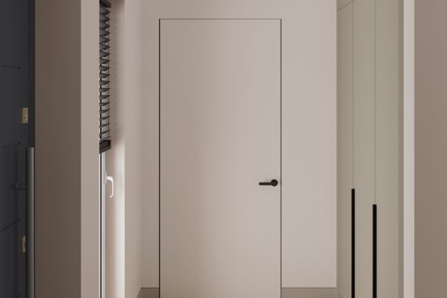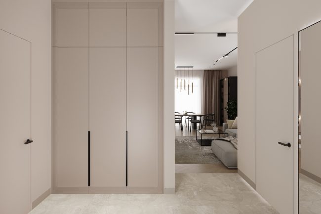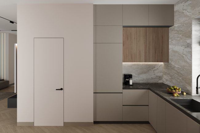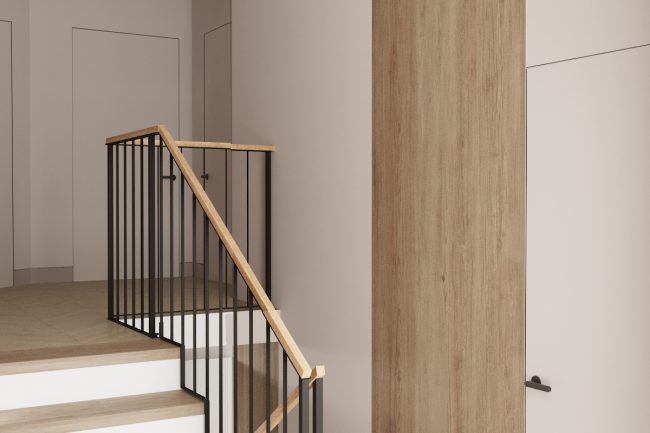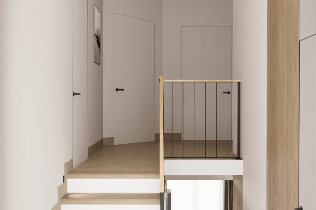 Podłoga w korytarzu pokryta jest płytkami, które imituje naturalny kamień, płynnie przechodząc w drewnianą podłogę ułożoną w stylu francuskiej jodły w salonie i kuchni. To tworzy wrażenie spójnego połączenia przestrzeni.