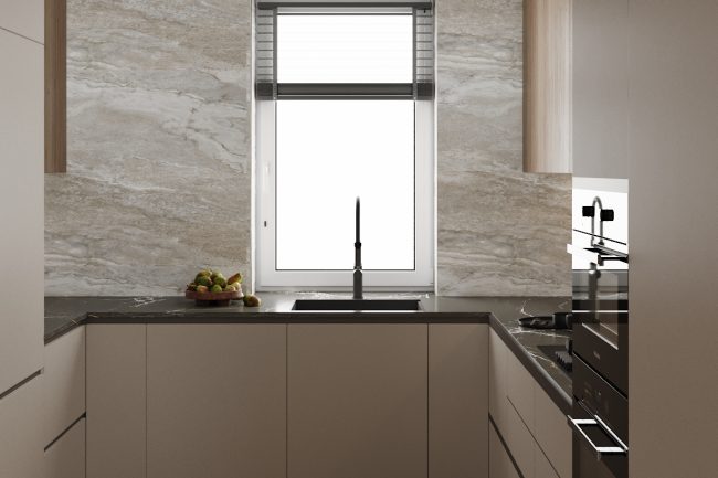 Strefa jadalni swobodnie przechodzi w strefę kuchni. Duży drewniany stół i szafka do serwowania z podświetleniem tworzą stylową i funkcjonalną przestrzeń do spożywania posiłków i rozrywki. Kuchnia jest w kształcie litery „P”, z wejściem do spiżarni.