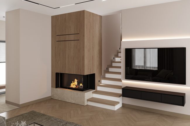W dużym salonie znajduje się narożna, modułowa szara kanapa, która zapewnia komfort i przytulność. Strefa kanapy jest ozdobiona pionowymi listwami z podświetleniem, co tworzy atmosferę nowoczesności i stylu. Kominek, wbudowany w kolumnę, pokryty jest płytkami wielkoformatowymi imitującymi drewno, co wprowadza przytulność i luksusowy akcent.