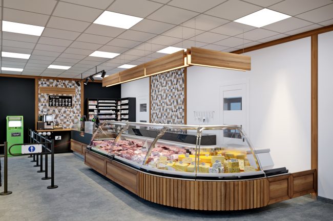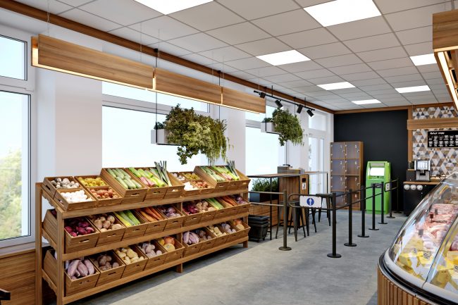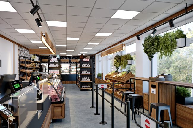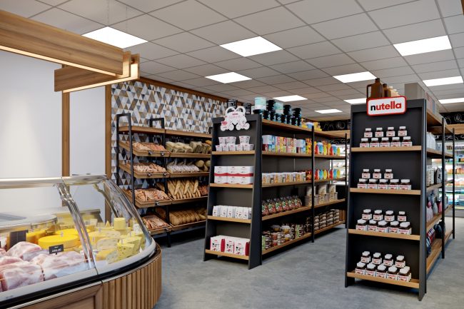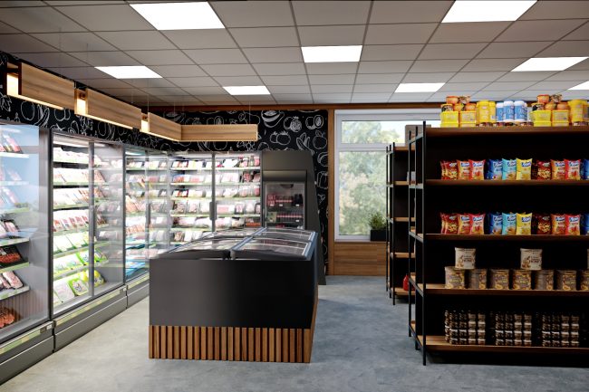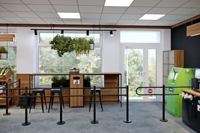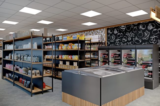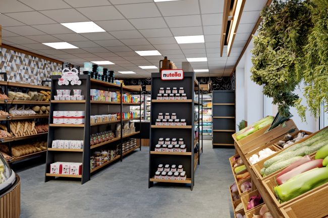 Ogólny design wnętrza łączy w sobie nowoczesny styl oraz funkcjonalność, co czyni sklep atrakcyjnym zarówno dla klientów, jak i personelu.