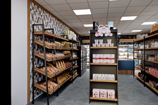 Dużo drewna obecnego w aranżacji równoważy surowość metalu i betonu. Drewniane półki, lady i elementy dekoracyjne dodają ciepła i naturalności, tworząc przytulność we wnętrzu sklepu oraz zapewniając harmonię pomiędzy materiałami industrialnymi a naturalnymi.