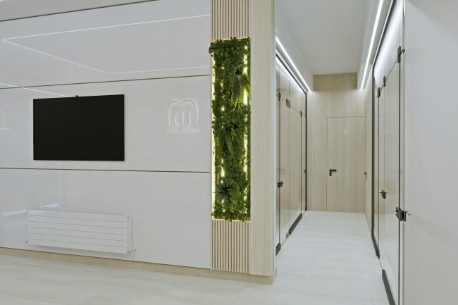 Przy wejściu pacjentów wita elegancka lada recepcyjna, wykonana w stylu nowoczesnego minimalizmu. Pomieszczenie jest utrzymane w jasnych tonach, z akcentami na naturalne materiały. Strefa oczekiwania jest wyposażona w wygodne meble i tworzy wrażenie przestronności dzięki szerokformatowym, połyskującym płytkom na ścianach.