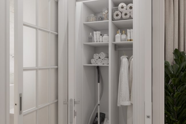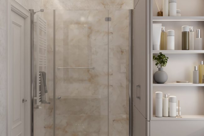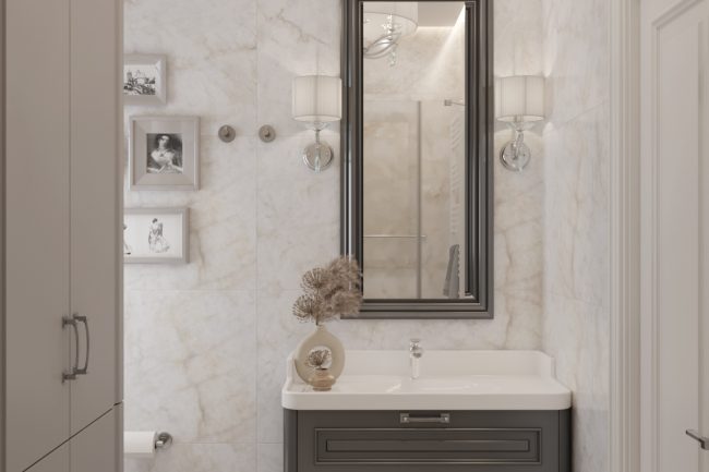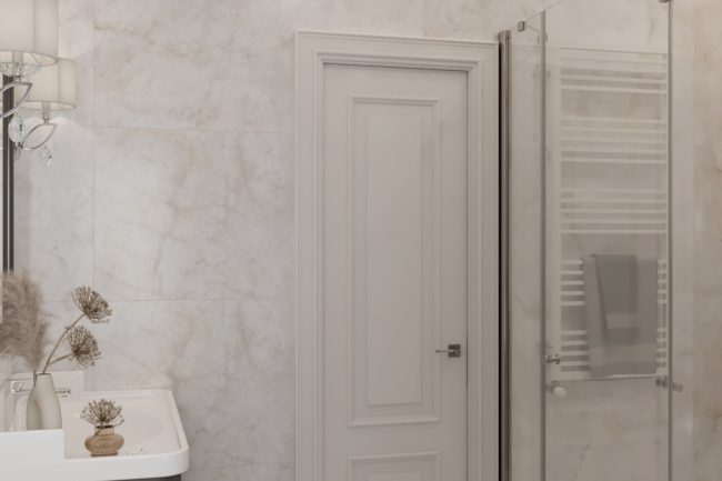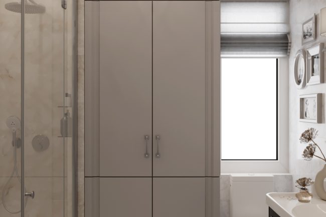 Łazienka wyróżnia się przestronnym układem, wyposażona w dużą kabinę prysznicową i wykończona ciepłym marmurem, co zapewnia komfort i luksus. Znajduje się tam także duża szafa do przechowywania, co sprawia, że pomieszczenie jest nie tylko estetyczne, ale i funkcjonalne.