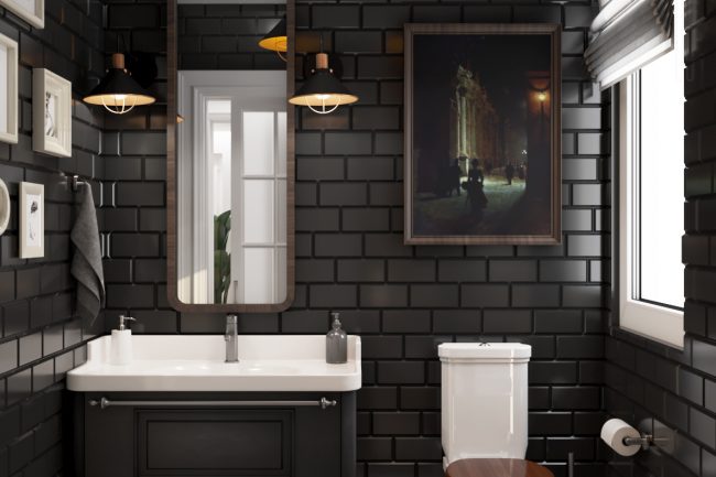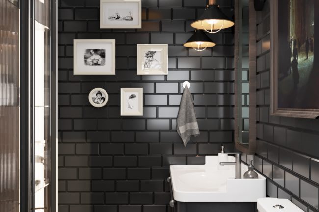 Z korytarza można wejść do łazienki wyłożonej czarnymi, półbłyszczącymi płytkami w kształcie cegiełek, co nadaje jej nowoczesny wygląd. Wyposażona jest w klasyczną konsolę z umywalką i toaletę, harmonizującą nowoczesne i klasyczne elementy.