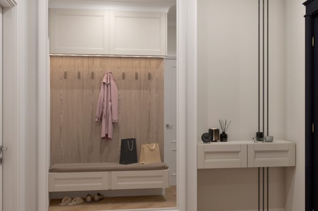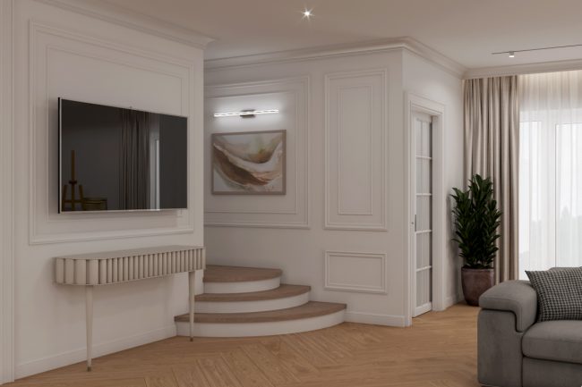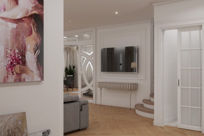 Z holu prowadzą drewniane schody na drugie piętro, harmonizujące z klasycznymi elementami wnętrza i podkreślające elegancki styl domu.