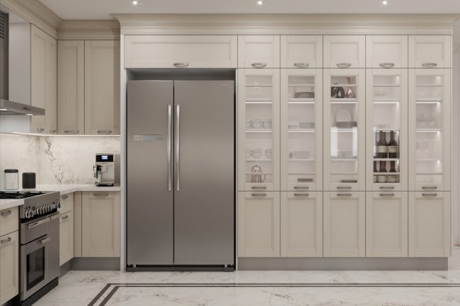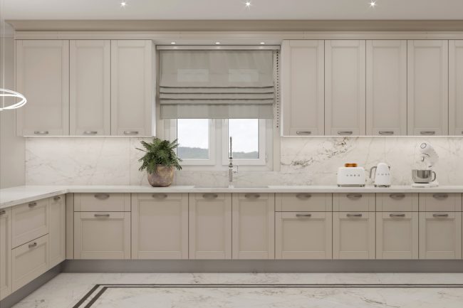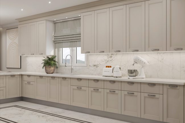 Jedną z kluczowych cech domu jest połączenie salonu z kuchnią, co tworzy przestronną i otwartą strefę do wypoczynku i gotowania. Duża amerykańska kuchnia wyposażona jest w liczne szafki i szuflady, zapewniające dużo miejsca do przechowywania. Na podłodze kuchni znajdują się płytki w stylu marmuru z czarnymi pasami dekoracyjnymi, dodające elegancji i stylu.