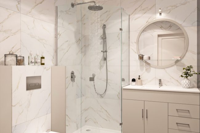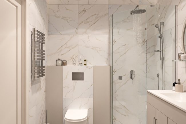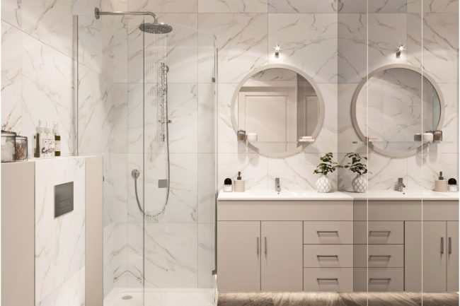 Projekt łazienki jest maksymalnie minimalistyczny, z tradyjną płytką na ścianach i podłodze w różnych odcieniach szarości. Oryginalności wnętrzu łazienki nadają kontrastowe panele, które tworzą występ na ścianie, wykończone mozaiką, biała szafka pod umywalkę o nietypowym kształcie przypominającym płatek, droga wbudowana w ścianę armatura oraz ogromne lustro.