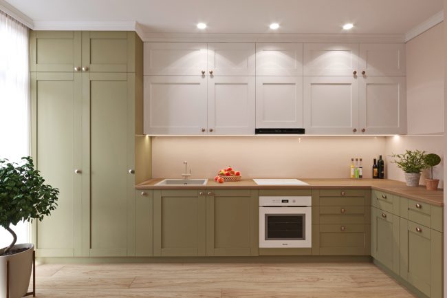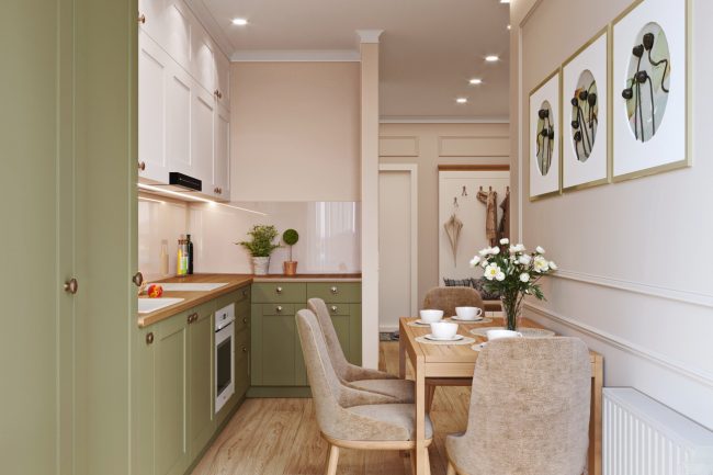 Projekt kuchni jest logiczną kontynuacją salonu. Brak zbędnych ścian między salonem a strefą kuchenną pozwala stworzyć ogólną kompozycyjną jedność i osiągnąć wizualne powiększenie przestrzeni. Wykonane na zamówienie czarne błyszczące fronty mebli kuchennych, pokryte lakierem fortepianowym, kontrastują z uchylnymi drzwiczkami wiszących szafek z modrzewia, a napinany sufit powtarza odcień sofy i jest podświetlony. Rozgraniczenie osiągnięto dzięki prostemu i trafnemu rozwiązaniu – rzędom lamp w stylu high-tech.