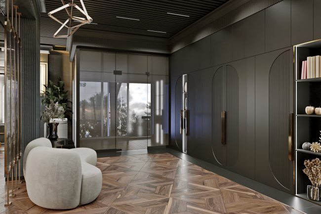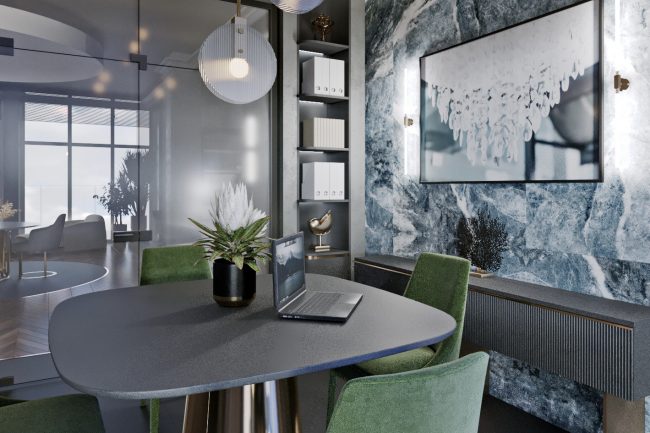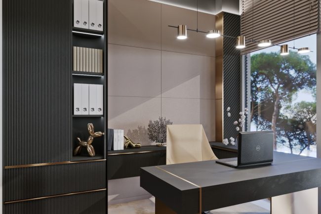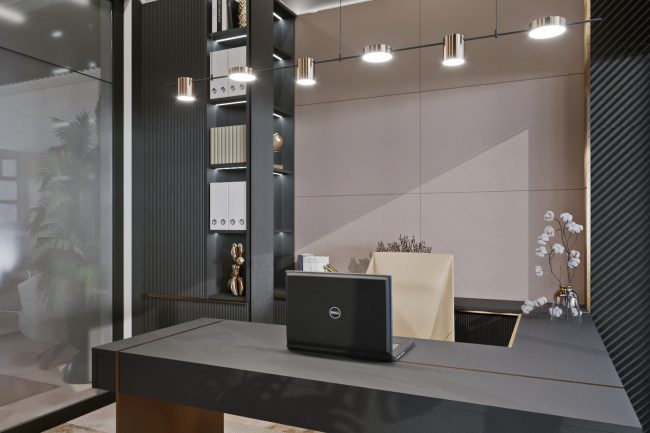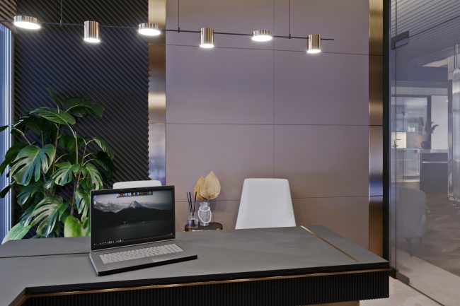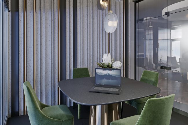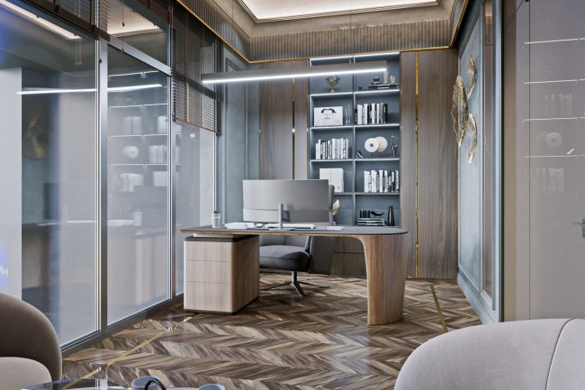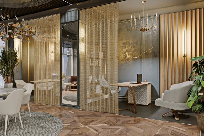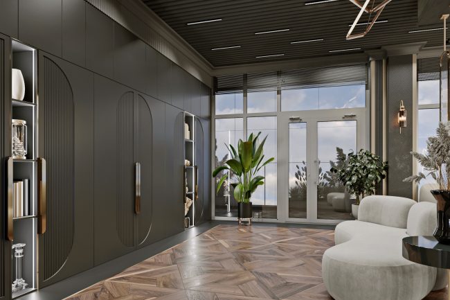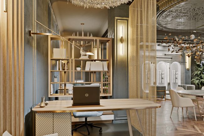 Na podłodze zastosowano płytki przypominające parkiet figuracyjny, co dodaje przestrzeni elegancji. Sufit pokryty jest tynkiem grafitowym z złotymi wstawkami, co tworzy poczucie luksusu i wyrafinowania. W dużej sali znajduje się miejsce do pracy z klientami oraz stanowiska pracy menedżerów, co zapewnia wygodę komunikacji i obsługi klientów.