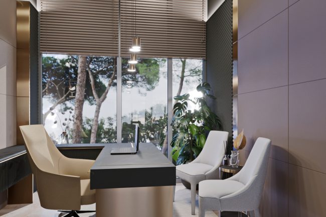 Osobno znajduje się VIP-sala, oddzielona szklaną przegrodą, co umożliwia obsługę klientów w ekskluzywnych warunkach. Gabinet dyrektora wygląda również jak szklana kostka z naturalnym parkietem na podłodze, co podkreśla prestiż pomieszczenia. W salonie przewidziano pomieszczenia pomocnicze zapewniające pełną funkcjonalność obiektu.