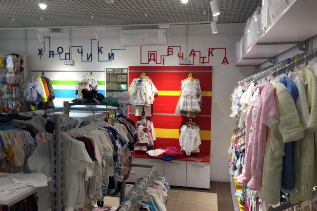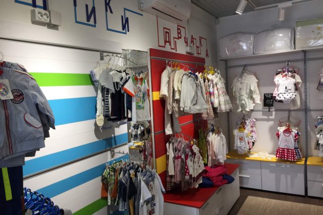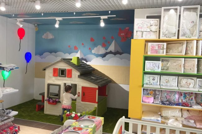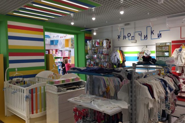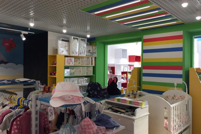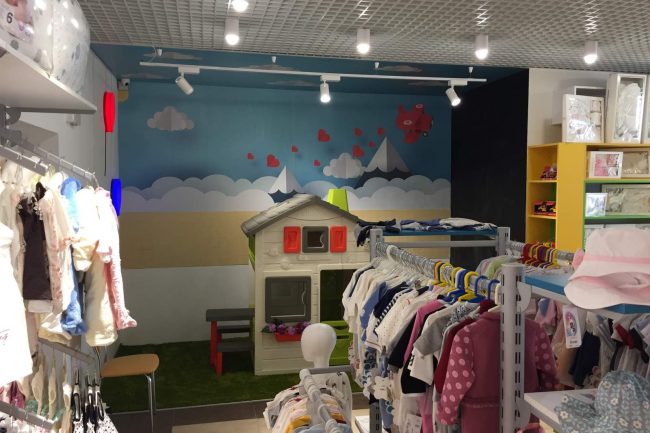 Przewidziano specjalną strefę do zabawy dla maluchów. Tutaj biały sufit jest zakryty dekoracyjną kratą, przestrzeń jest dobrze oświetlona, a na podłodze znajduje się dywan ze sztucznej trawy. Znalazło się miejsce nie tylko na półki, regały, stojaki z odzieżą dziecięcą i zabawkami, ale także na domek do zabawy. Podczas gdy rodzice wybierają rzeczy dla dzieci, maluchy mogą odpocząć i się bawić.