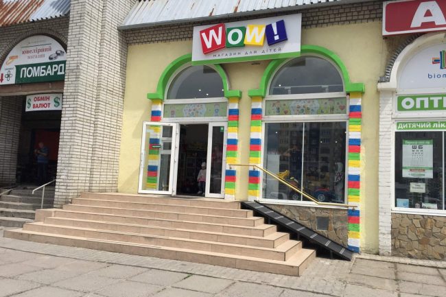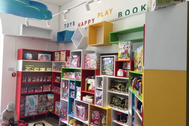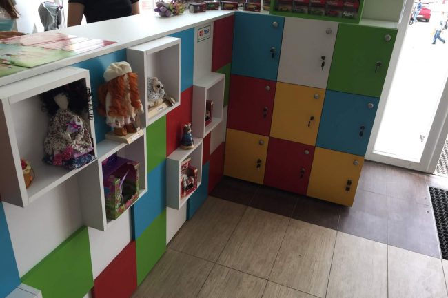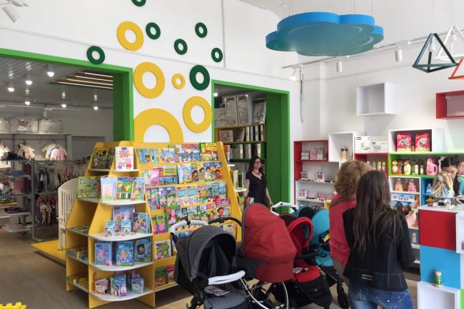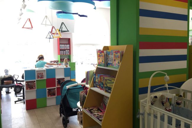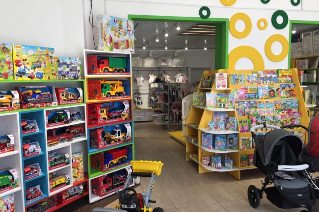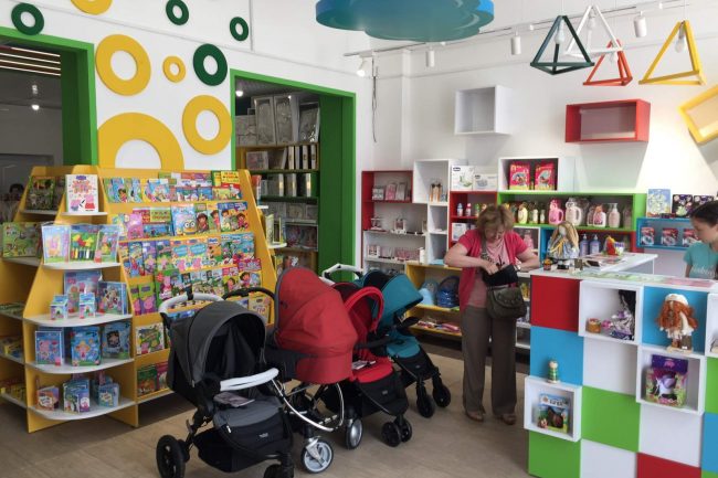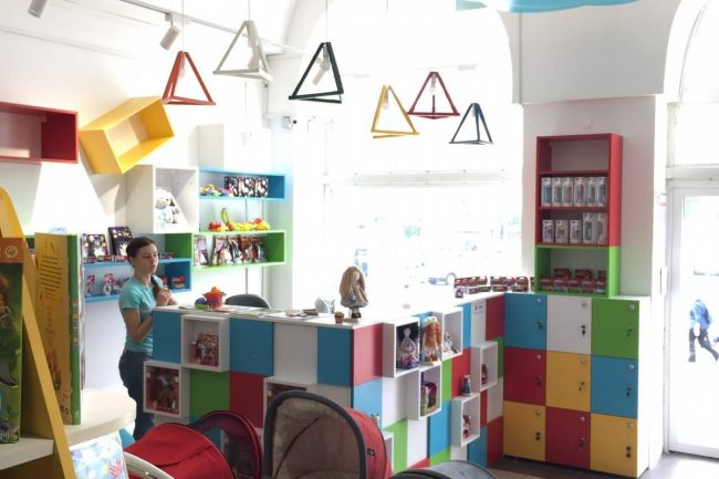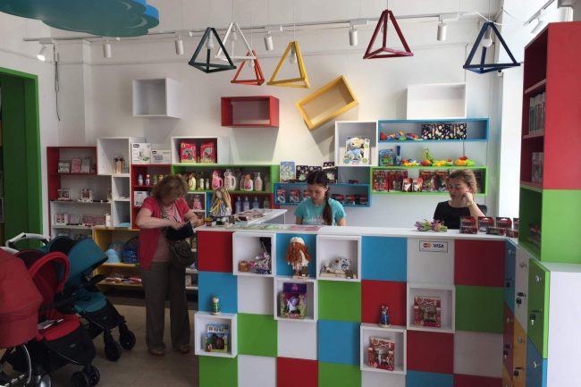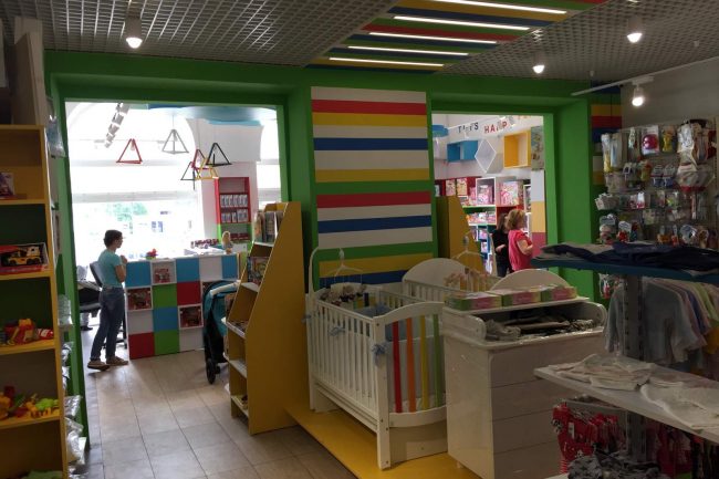 Design wnętrza sklepu dla dzieci jest harmonijny we wszystkich szczegółach i starannie opracowany — od wejścia po najdalsze zakątki pomieszczenia. Paleta kolorów składa się z radosnych, żywych odcieni — trawiasto-zielonego, żółtego, czerwonego, niebieskiego i białego. Przeplatanie się tych kolorów pojawia się zarówno w wystroju wejścia na zewnątrz, jak i na ladzie recepcyjnej, a także na standach i półkach. Jasne kwadraty, prostokąty przyciągają uwagę dzieci i ich rodziców, tworząc pozytywną atmosferę, zachęcającą do zabawy i pozostawiającą przyjemne wrażenia.