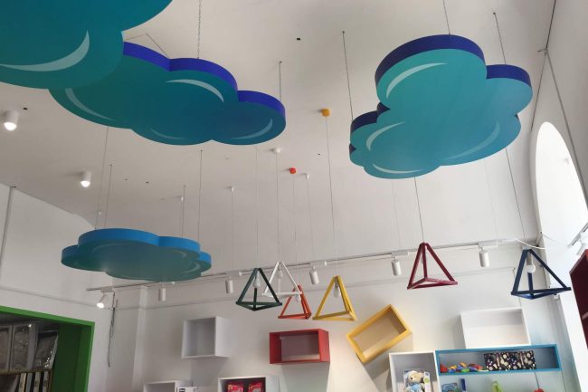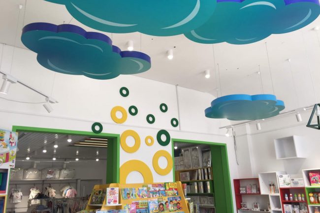 Dla książek, albumów i innych towarów zaprojektowano jasne regały o różnych kształtach — prostokątne, trójkątne. Pod sufitem wiszą wesołe, niebieskie chmurki. Oświetlenie zapewniają długie lampy oświetlenia dziennego i punktowe lampy.