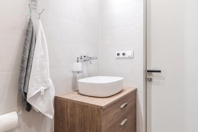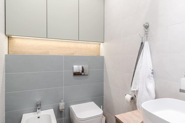 В дизайні просторого санвузла використано традиційне поєднання кольорів білосніжних ванни, унітаза, біде, сірих стінних панелей, дерев’яної тумби під великою керамогранітною раковиною прямокутної форми та цегляної стіни.