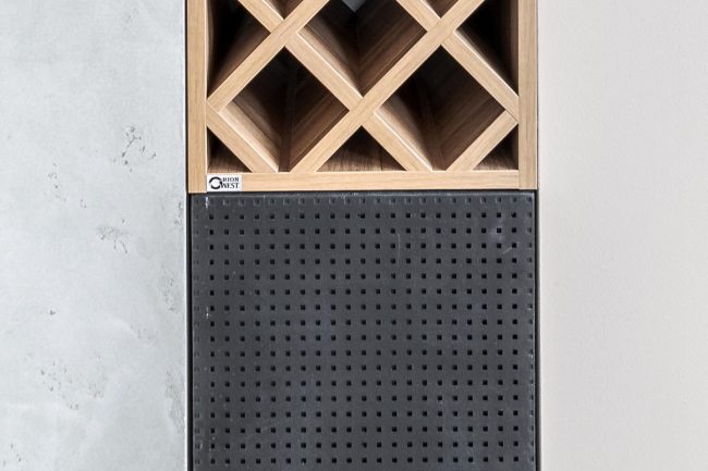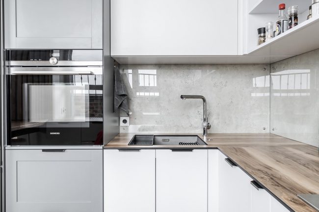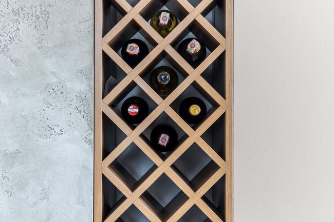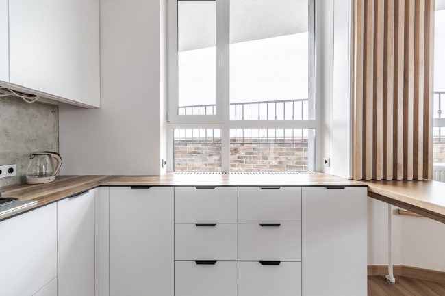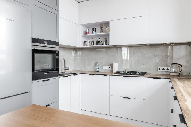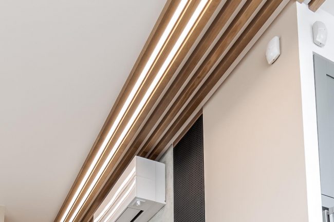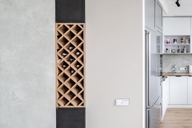 Лінія розмежування кухонного приміщення та коридору позначена продовженням паралельних рейок з натурального дерева на стелі та стіні, та завершується дерев’яною барною стійкою-столом. Загальне враження атмосферності та свіжості підсилюється яскравим денним освітленням завдяки великим вікнам та виходу на широку лоджію.