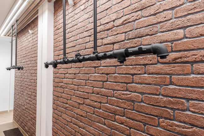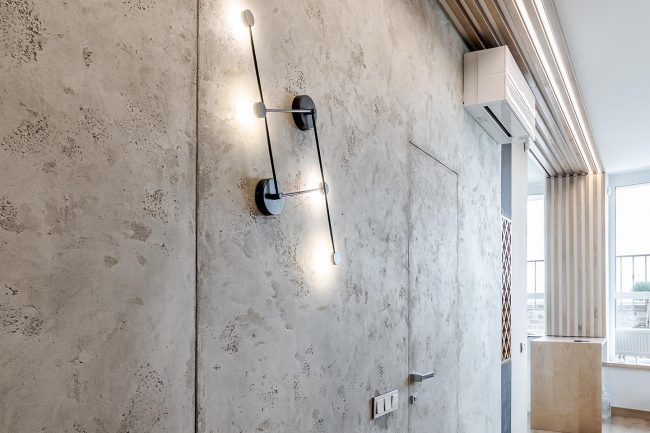 В інтер’єрі вдало використане поєднання базових натуральних матеріалів. Цегляна стіна справа в коридорі доповнена притаманним індустріальному стилю елементом у вигляді вінтажних чавунних труб, протилежна стіна декорована штукатуркою під бетон, сучасні лінійні світильники сховані між дерев’яними рейками під стелею. Насичений колір теракоти вносить нотку свіжості в композицію сірого відтінку бетону, білосніжних стін, стелі та в загальний дизайн квартири.