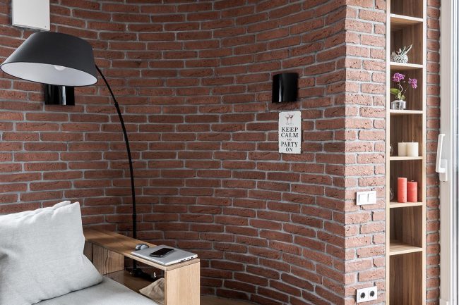 Зона відпочинку нестандартної півкруглої конфігурації облицьована ретельно викладеною цеглою. Її обладнано вбудованим відкритим дерев’яним стелажем, полиці якого заповнені милими дрібничками.
