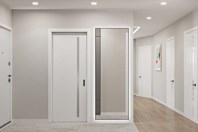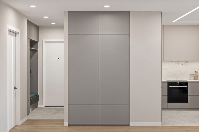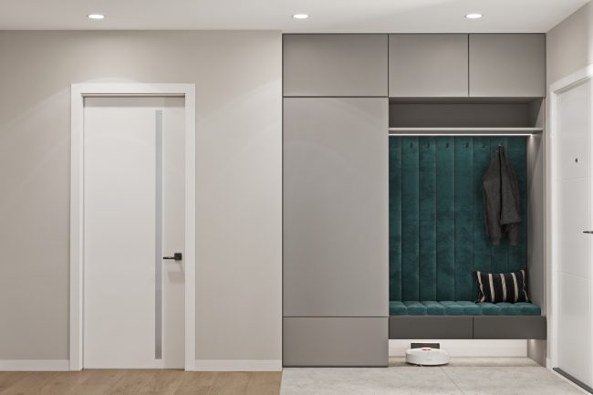 При вході у квартиру нас зустрічає просторий коридор з шафою для роздягання та м’якою частиною для сидіння у смарагдовому кольорі. Цей кольор додає енергії та живості до вхідної зони. Велике дзеркало з контурною підсвіткою створює візуальний ефект простору та світлоти.