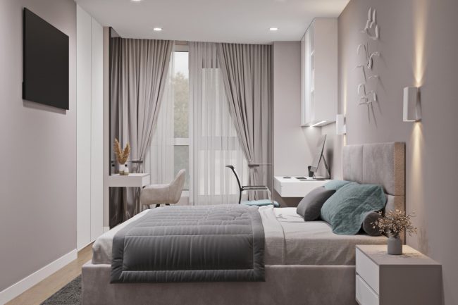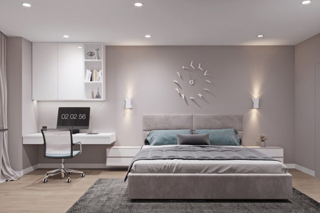 Спальня вражає приглушеними пастельними кольорами та стильним дизайном. Велике м’яке ліжко з приліжковими тумбами та робочий стіл з великою шафою для зберігання документів над ним створюють простір для відпочинку та роботи. У спальні є вихід у гардероб через приховані двері, що забезпечує зручність та організованість.
