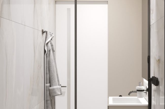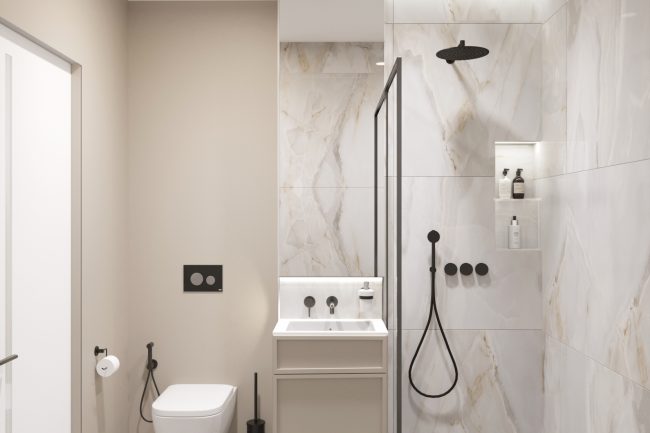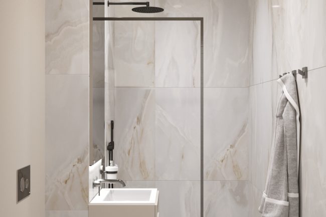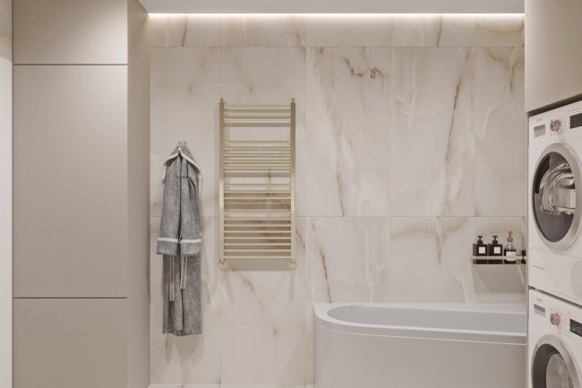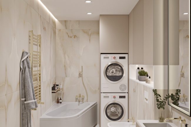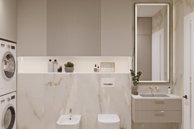 Ванна кімната виконана в теплих відтінках мармурової плитки та обладнана всією необхідною сантехнікою та прально-сушильною машинами, що робить її функціональною та зручною для повсякденного використання.