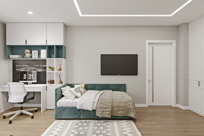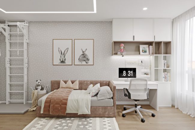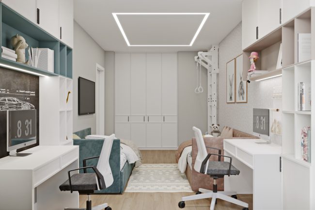 Квартира також має простору дитячу кімнату з двома великими функційними робочими місцями та шафами. Довге приміщення поділене на зони для спання та навчання, що створює комфортне середовище для розвитку та відпочинку дітей.