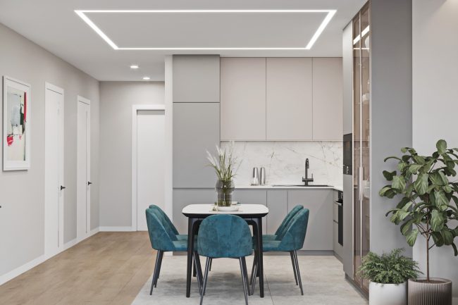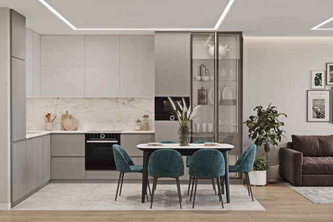 З коридору ми потрапляємо у кухню, яка виконана в світло-сірому та темно-сірому кольорах. Вона вражає своєю величчю та функціональністю, з верхніми шафами до стелі та всією необхідною технікою. Плитка під глянцевий мармур на фартусі додає розкоші та елегантності. Біля кухні стоїть стіл з кріслами у смарагдовій оббивці, за якими можна комфортно посидіти та насолодитися смачним обідом.