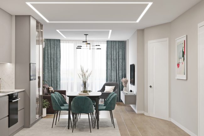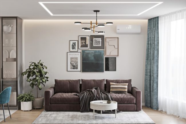 Кухня без дверей межує з вітальнею, де розміщений великий м’який коричневий диван та телевізор. Квадратна полоска вбудованого LED профілю на стелі та люстра додають атмосфери затишку та стилю. З цієї зони легко потрапити у спальню.