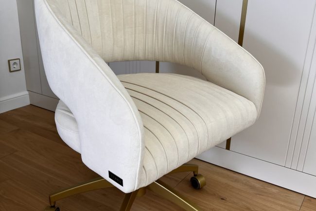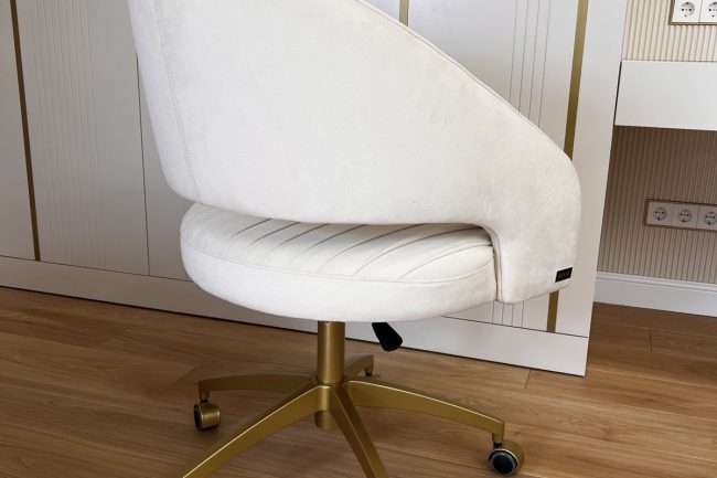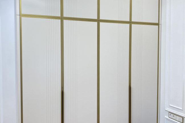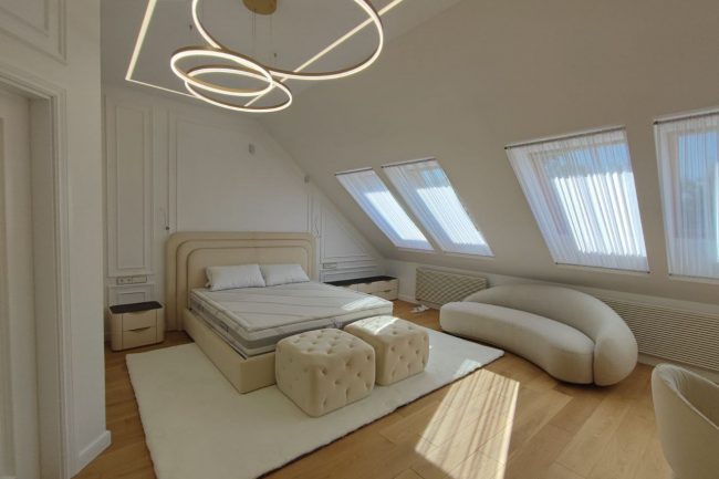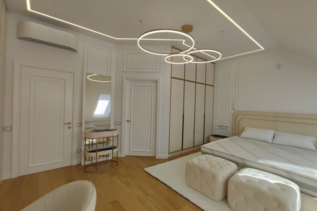 На підлозі під ліжком лежить м’який килим з стриженого синтетичного кролика, який робить простір ще більш затишним. Основна підлога виконана з дубової паркетної дошки, укладеної палубним способом, яка додає тепла і природної краси кімнаті. Стіни пофарбовані в теплий білий колір, прикрашені молдингами, що створює класичний фон для сучасних деталей інтер’єру.