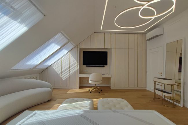 На стелі акцентом виступає люстра з радіусом, навколо якої вбудована лінійна LED підсвітка, що створює м’яке освітлення та додає простору відчуття легкості й простору.